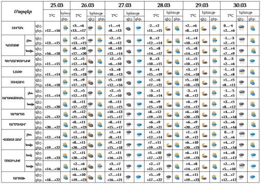 Մարտի 25-ի ցերեկը հնարավոր է, 26-27-ը, 28-ի գիշերը և 29-ի ցերեկը, 30-ի գիշերը սպասվում է կարճատև անձրև, հնարավոր է նաև ամպրոպ։ Մարտի 28-ին, 29-ի գիշերը և 30-ի ցերեկը սպասվում է առանց տեղումների եղանակ։