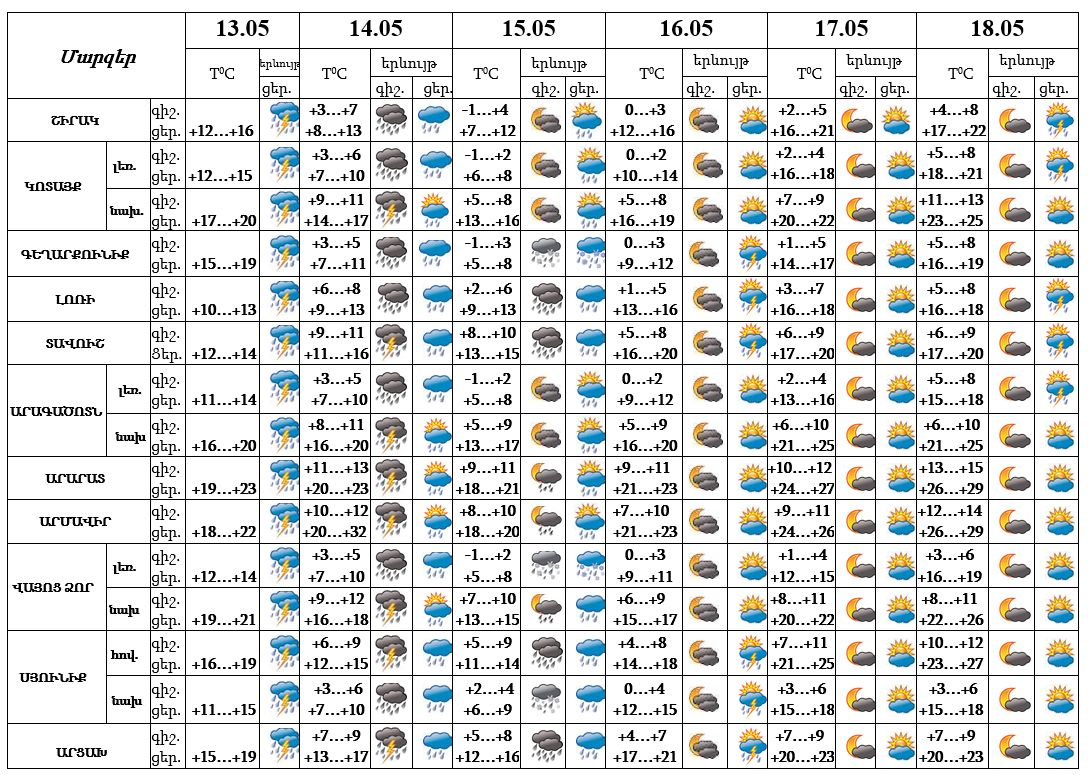Մայիսի 13-ի ցերեկը, 14-15-ը ժամանակ առ ժամանակ շրջանների զգալի մասում, 16-ի և 18-ի ցերեկը առանձին շրջաններում սպասվում է անձրև և ամպրոպ, 13-ի երեկոյան, 14-ի գիշերն առանձին վայրերում ինտենսիվ, 15-ին լեռնային առանձին շրջաններում տեղումները կլինեն թաց ձյան տեսքով։ Մայիսի 13-14-ն առանձին հատվածներում հնարավոր է կարկուտ, 13-15-ը՝ նաև մառախուղ։ Մայիսի 16-ի և 18-ի գիշերը, 17-ին սպասվում է առանց տեղումների եղանակ։