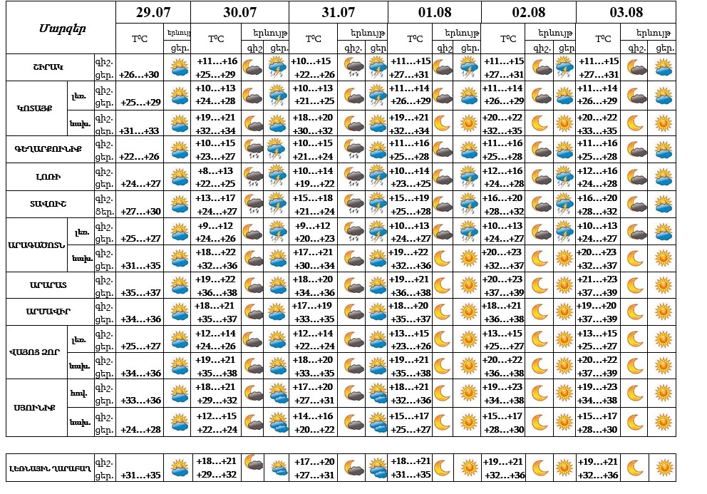 Հուլիսի 29-ի ցերեկը, օգոստոսի 3-ին սպասվում է առանց տեղումների եղանակ, 30-31-ին և օգոստոսի 1-2-ին կեսօրից հետո առանձին շրջաններում սպասվում է կարճատև անձրև և ամպրոպ։