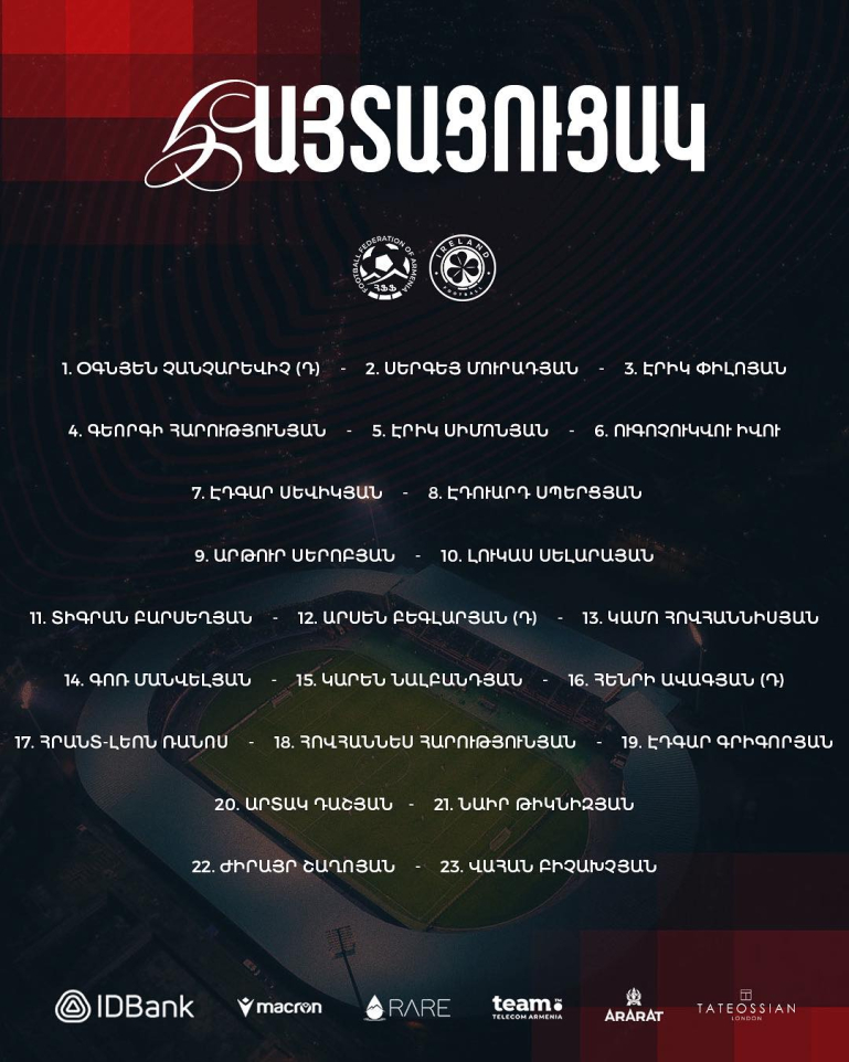 ՀՖՖ-ն ներկայացրել է Հայաստանի ազգային հավաքականի վերջնական հայտացուցակը՝ Իռլանդիայի հետ հանդիպմանը: